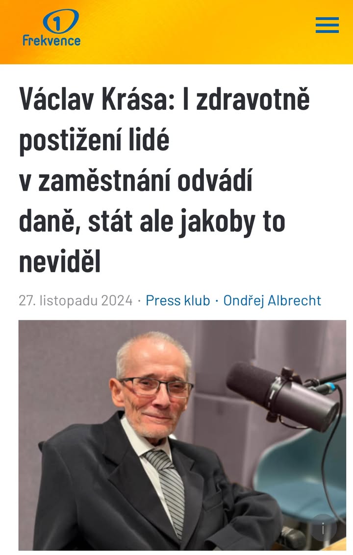 Václav Krása: I zdravotně postižení lidé v zaměstnání odvádí daně, stát ale jakoby to neviděl 🎙️www.frekvence1.cz/radio/zaznamy-poradu/press-klub/vaclav-krasa-i-zdravotne-postizeni-lide-v-zamestnani-odvadi-dane-stat-ale-jakoby-to-nevidel.shtml Sněmovna minulý týden schválila změny v podpoře zaměstnávání lidí